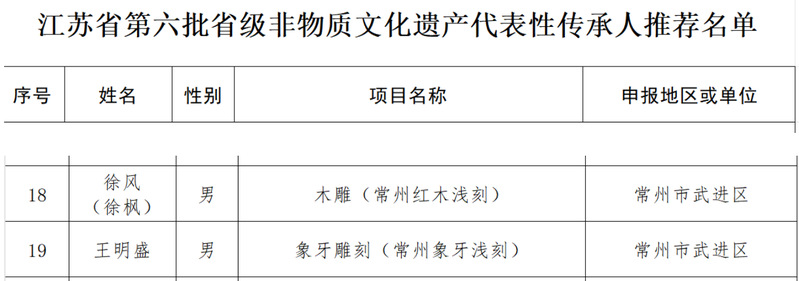 近日,江蘇省文化和旅游廳發(fā)布《關(guān)于江蘇省第六批省級非物質(zhì)文化遺產(chǎn)代表性傳承人的公示》,我校兩位教師徐風、王明盛成功入選,分別被授予“木雕(常州紅木淺刻)”和“象牙雕刻(常州象牙淺刻)”項目的省級非物質(zhì)文化遺產(chǎn)代表性傳承人。這是我校在文化傳承創(chuàng)新領(lǐng)域取得的又一重要成果,彰顯了學(xué)校在非遺保護與人才培養(yǎng)方面的深厚底蘊與社會貢獻。