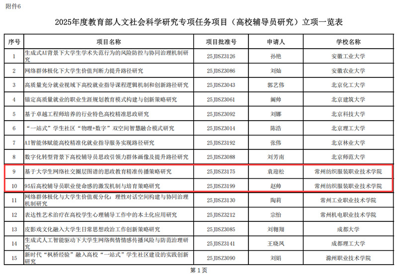 近日,教育部社會(huì)科學(xué)司公布2025年度教育部人文社會(huì)項(xiàng)目(高校輔導(dǎo)員研究)評(píng)審結(jié)果。我校推薦申報(bào)的2項(xiàng)輔導(dǎo)員專項(xiàng)課題均獲立項(xiàng)。2025年全國(guó)范圍內(nèi)有2項(xiàng)輔導(dǎo)員專項(xiàng)課題獲批的高職院校僅3家,我校是全省唯一獲此佳績(jī)的高職院。這一突破性成果,充分彰顯了我校輔導(dǎo)員隊(duì)伍專業(yè)化、職業(yè)化建設(shè)的扎實(shí)成效與穩(wěn)步提升的良好態(tài)勢(shì)。