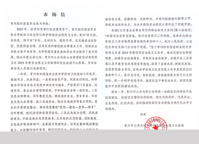 近日,常州市公共交通和單位內(nèi)部安全保衛(wèi)公安局向我校發(fā)來(lái)表?yè)P(yáng)信,對(duì)我校保衛(wèi)處在2025年度治安保衛(wèi)工作中取得的突出成績(jī)予以通報(bào)表?yè)P(yáng),并向全體安保人員致以誠(chéng)摯慰問(wèn)。這份來(lái)自公安機(jī)關(guān)的正式認(rèn)可,充分體現(xiàn)了我校在平安校園建設(shè)方面取得的扎實(shí)成效。