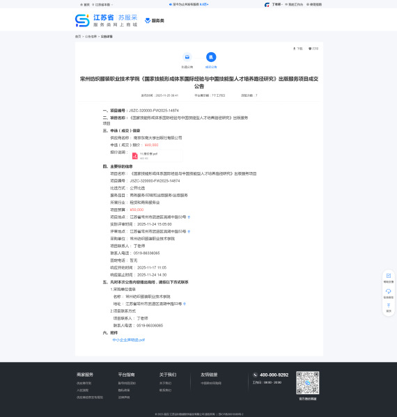 我校數(shù)字化設(shè)計(jì)與樣品開(kāi)發(fā)實(shí)訓(xùn)室設(shè)備采購(gòu)項(xiàng)目以詢價(jià)方式采購(gòu),現(xiàn)將結(jié)果公告如下:一、項(xiàng)目名稱:數(shù)字化設(shè)計(jì)與樣品開(kāi)發(fā)實(shí)訓(xùn)室設(shè)備采購(gòu)二、采購(gòu)編號(hào):CB128072025000022三、公告媒體及日期:2025年11月21日起在常州紡織服裝職業(yè)技術(shù)學(xué)院網(wǎng)站上發(fā)布采購(gòu)公告四、確定流標(biāo)日期:2025年11月27日五、流標(biāo)理由:參與投標(biāo)的供應(yīng)商不足三家六、聯(lián)系方式:聯(lián)系人:丁老師聯(lián)系電話:0519-86336065。聯(lián)系地址:江蘇省常州市武進(jìn)區(qū)湖塘鎮(zhèn)滆湖中路53號(hào)常州紡織服裝職業(yè)技術(shù)學(xué)院2025年11月28日