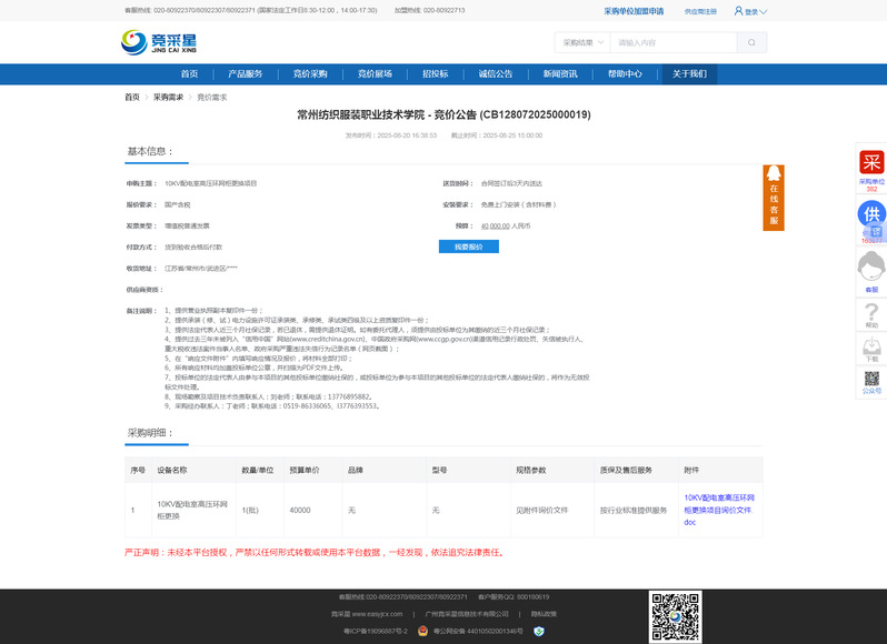 采購(gòu)編號(hào):信息服務(wù)中心-2025-11 信息服務(wù)中心對(duì)紡織學(xué)院4號(hào)樓B座1層高性能纖維及復(fù)合材料產(chǎn)教融合實(shí)踐中心弱電項(xiàng)目采用詢價(jià)方式進(jìn)行采購(gòu),現(xiàn)請(qǐng)符合條件的供應(yīng)商參加投標(biāo),有關(guān)事項(xiàng)公告如下:一、采購(gòu)內(nèi)容高性能纖維及復(fù)合材料產(chǎn)教融合實(shí)踐中心弱電項(xiàng)目,詳見(jiàn)詢價(jià)單及弱電施工圖。本項(xiàng)目為總價(jià)包干,設(shè)定最高限價(jià)為為18055元,(大寫)壹萬(wàn)捌仟零伍拾伍元整。二、成交原則在符合采購(gòu)需求、質(zhì)量和服務(wù)相等且報(bào)價(jià)未超過(guò)采購(gòu)預(yù)算的前提下,以提出最低報(bào)價(jià)的響應(yīng)單位為成交供應(yīng)商。若最低報(bào)價(jià)相同,則依次按質(zhì)保期內(nèi)供應(yīng)商夜間接到校方報(bào)修電話后到達(dá)現(xiàn)場(chǎng)時(shí)間短優(yōu)先、承諾項(xiàng)目交付時(shí)間短優(yōu)先的順序排列選擇成交供應(yīng)商。三、對(duì)供應(yīng)商的基本要求:1、必須符合《政府采購(gòu)法》第二十二條的相關(guān)規(guī)定;2、具有獨(dú)立承擔(dān)民事責(zé)任的能力;3、具有良好的商業(yè)信譽(yù)和健全的財(cái)務(wù)會(huì)計(jì)制度;4、具有履行合同所必需的設(shè)備和專業(yè)技術(shù)能力;5、有依法繳納稅收和社會(huì)保障資金的良好記錄;6、單位負(fù)責(zé)人為同一人或者存在直接控股、管理關(guān)系的不同供應(yīng)商,不得參加同一合同項(xiàng)下的采購(gòu)活動(dòng);7、參加采購(gòu)活動(dòng)前三年內(nèi),在經(jīng)營(yíng)活動(dòng)中無(wú)重大違法記錄或無(wú)不良行為記錄(如該記錄對(duì)