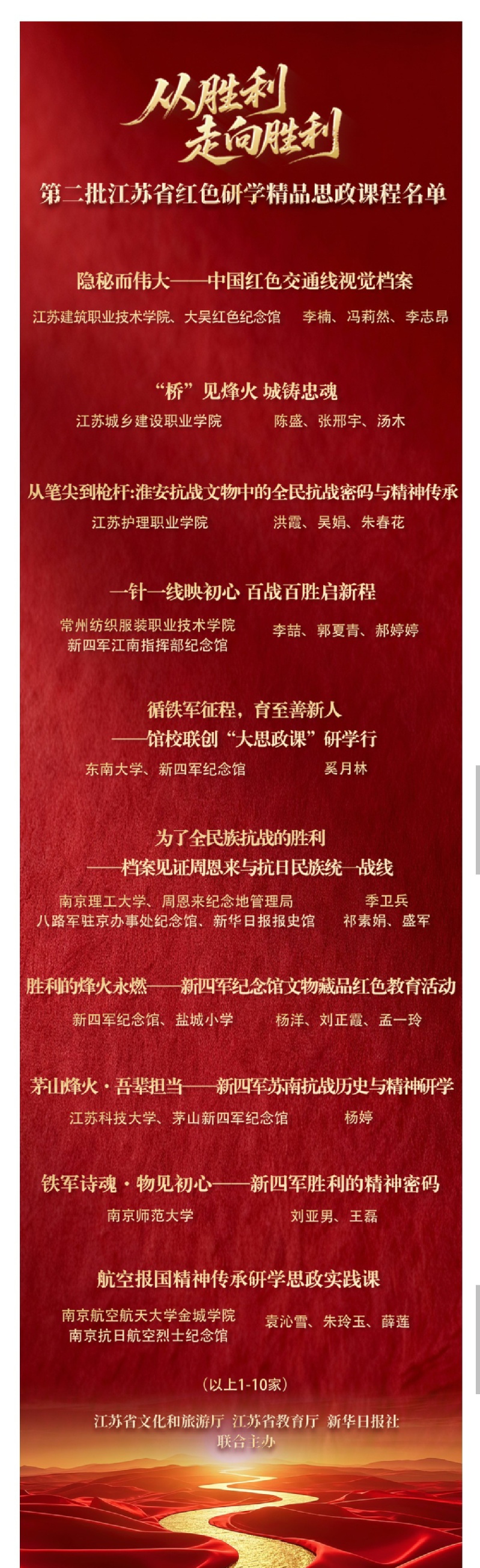 近日,江蘇省文化和旅游廳、江蘇省教育廳和新華日?qǐng)?bào)社共同發(fā)布《關(guān)于公布第二批江蘇省紅色研學(xué)精品思政課程名單的通知》。我校馬克思主義學(xué)院與新四軍江南指揮部紀(jì)念館共同打造的《一針一線映初心百戰(zhàn)百勝啟新程》課程成功入選,并在評(píng)選中取得總分第四名的好成績(jī)。