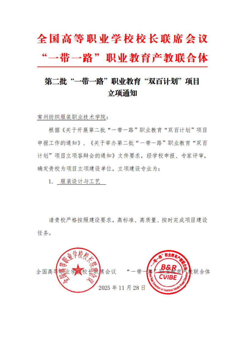 近日,全國高等職業(yè)學校校長聯(lián)席會議、“一帶一路”職業(yè)教育產教聯(lián)合體正式公布第二批“一帶一路”職業(yè)教育“雙百計劃”項目立項名單,我校憑借扎實的產教融合基礎、清晰的國際化發(fā)展思路及優(yōu)質的項目申報方案,在激烈競爭中脫穎而出,服裝設計與工藝專業(yè)成功獲批立項建設,標志著我校職業(yè)教育國際化發(fā)展邁入新階段。
