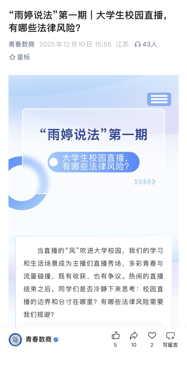 此外,數(shù)字商貿(mào)學(xué)院積極拓展普法路徑,依托學(xué)院官方微信公眾號(hào)打造線上法治宣傳陣地,精心開設(shè)“雨婷說法”普法專欄。學(xué)院特邀具有法律專業(yè)背景的輔導(dǎo)員彭雨婷擔(dān)任主講人,聚焦大學(xué)生校園直播的法律風(fēng)險(xiǎn)等與學(xué)生息息相關(guān)的熱點(diǎn)話題,通過通俗易懂的解讀、貼合實(shí)際的案例分析,為同學(xué)們厘清法律邊界、普及法律知識(shí)。專欄內(nèi)容精準(zhǔn)對(duì)接學(xué)生需求,兼具專業(yè)性與實(shí)用性,一經(jīng)推出便廣受師生好評(píng)。
