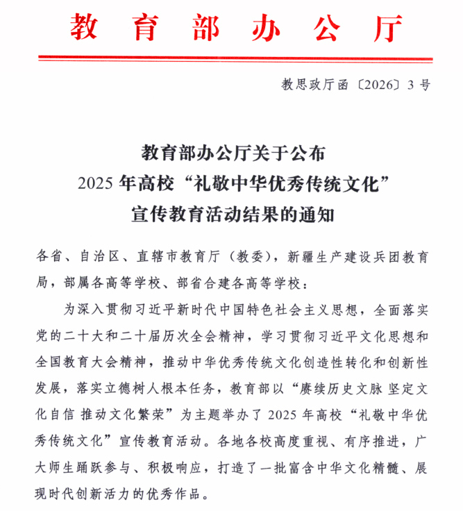 “禮敬中華優(yōu)秀傳統(tǒng)文化”宣傳教育活動(dòng)由教育部思想政治工作司牽頭主辦,是教育部立足中華優(yōu)秀傳統(tǒng)文化傳承發(fā)展,持續(xù)加強(qiáng)高校傳統(tǒng)文化教育、深化校園文化建設(shè)的重要長效舉措,旨在推動(dòng)中華文脈在校園落地生根、薪火相傳。2025年活動(dòng)共遴選全國高校優(yōu)秀作品305項(xiàng),江蘇省高職院校共有13個(gè)項(xiàng)目入選,我校2項(xiàng)作品入選位列江蘇省高職院校第二位,實(shí)現(xiàn)重大突破,充分展現(xiàn)了學(xué)校在文化育人領(lǐng)域的扎實(shí)積累和創(chuàng)新探索。