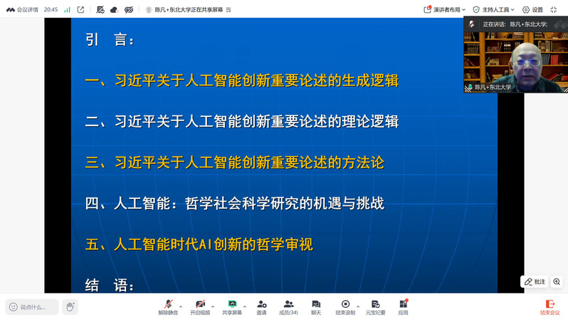 為深入學(xué)習(xí)貫徹習(xí)近平總書記關(guān)于人工智能創(chuàng)新的重要論述,4月7日晚,馬克思主義學(xué)院舉辦“時(shí)代新人鑄魂工程”系列主題沙龍活動(dòng),特邀國(guó)家重點(diǎn)學(xué)科——東北大學(xué)科學(xué)技術(shù)哲學(xué)研究中心主任、教育部“985工程”科技與社會(huì)(STS)哲學(xué)社會(huì)科學(xué)創(chuàng)新基地首席教授、哲學(xué)一流建設(shè)學(xué)科(高原學(xué)科)首席教授陳凡作題為《習(xí)近平關(guān)于人工智能創(chuàng)新重要論述的理論意蘊(yùn)》的學(xué)術(shù)報(bào)告?;顒?dòng)由學(xué)院副院長(zhǎng)邊婧主持,全體教師參加。