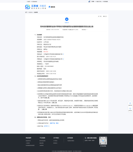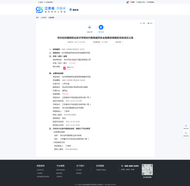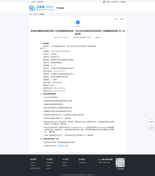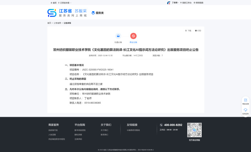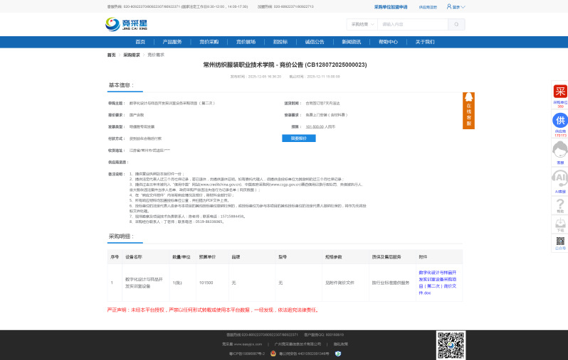我校數(shù)字化設(shè)計(jì)與樣品開發(fā)實(shí)訓(xùn)室設(shè)備采購項(xiàng)目以詢價(jià)方式采購,現(xiàn)將結(jié)果公告如下:一、項(xiàng)目名稱:數(shù)字化設(shè)計(jì)與樣品開發(fā)實(shí)訓(xùn)室設(shè)備采購二、采購編號(hào):CB128072025000022三、公告媒體及日期:2025年11月21日起在常州紡織服裝職業(yè)技術(shù)學(xué)院網(wǎng)站上發(fā)布采購公告四、確定流標(biāo)日期:2025年11月27日五、流標(biāo)理由:參與投標(biāo)的供應(yīng)商不足三家六、聯(lián)系方式:聯(lián)系人:丁老師聯(lián)系電話:0519-86336065。聯(lián)系地址:江蘇省常州市武進(jìn)區(qū)湖塘鎮(zhèn)滆湖中路53號(hào)常州紡織服裝職業(yè)技術(shù)學(xué)院2025年11月28日